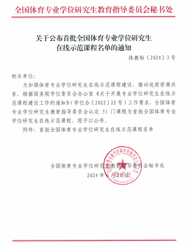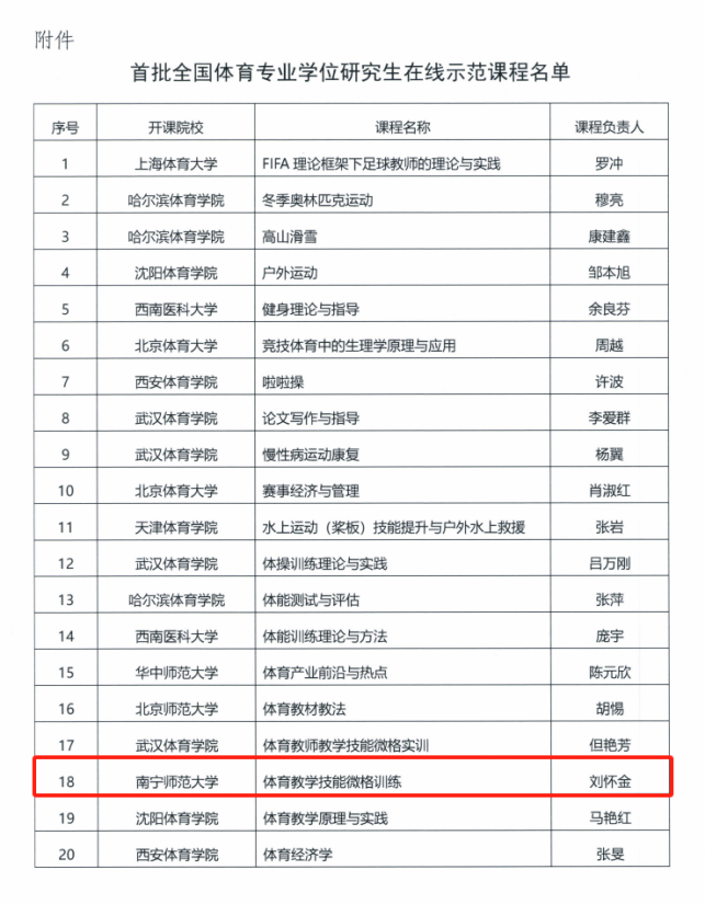 6月20日,全国体育专业学位研究生教育指导委员会印发了《关于公布首批全国体育专业学位研究生在线示范课程名单的通知》(体教秘〔2024〕3号),英国上市公司365推荐的《体育教学技能微格训练》课程名列其中,与全国25所高校的51门课程荣获首批立项,是荣获首批立项高校中的8所师范类高校之一,是广西唯一立项高校。